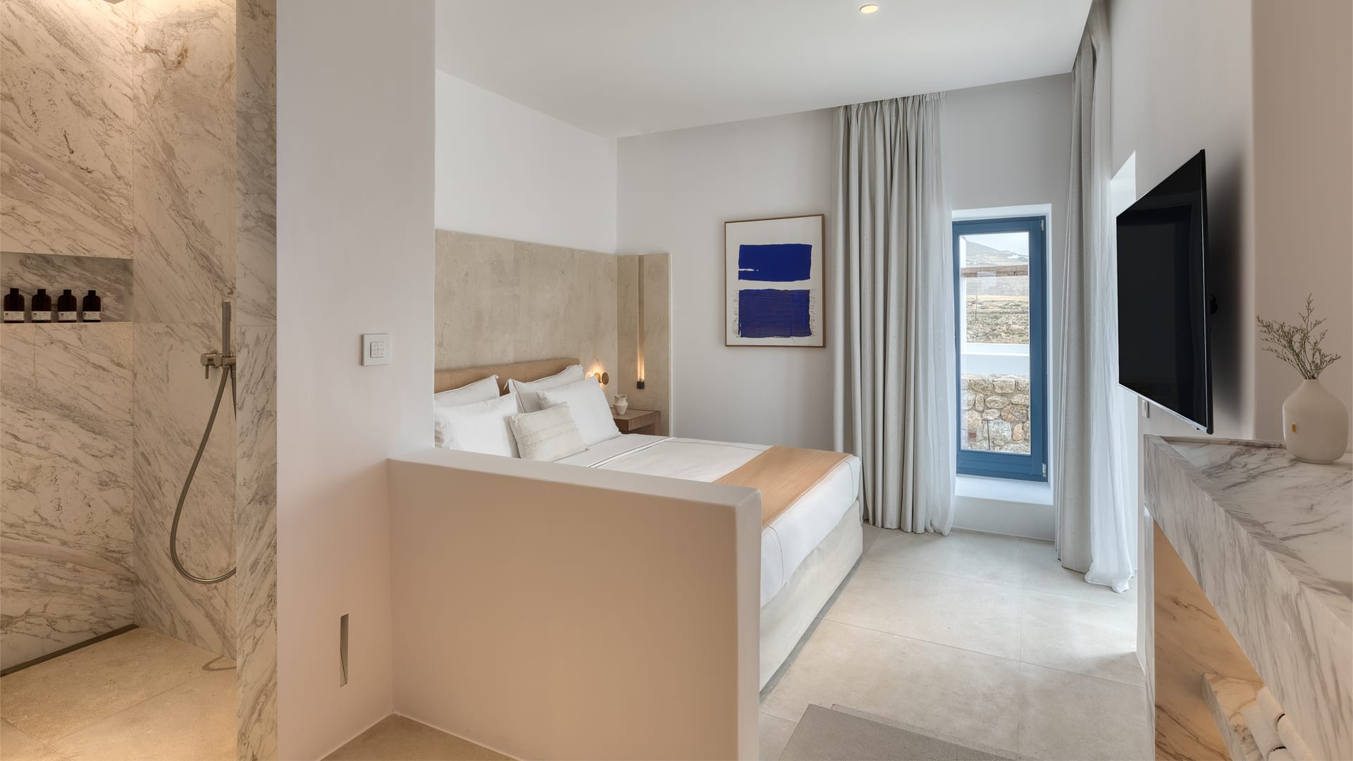 Graceful and spacious bedrooms, marble-wrapped bathrooms, and endless terraces with swimming pools perfect for long, easy days under the Aegean sun. A private haven made for connection and rest.