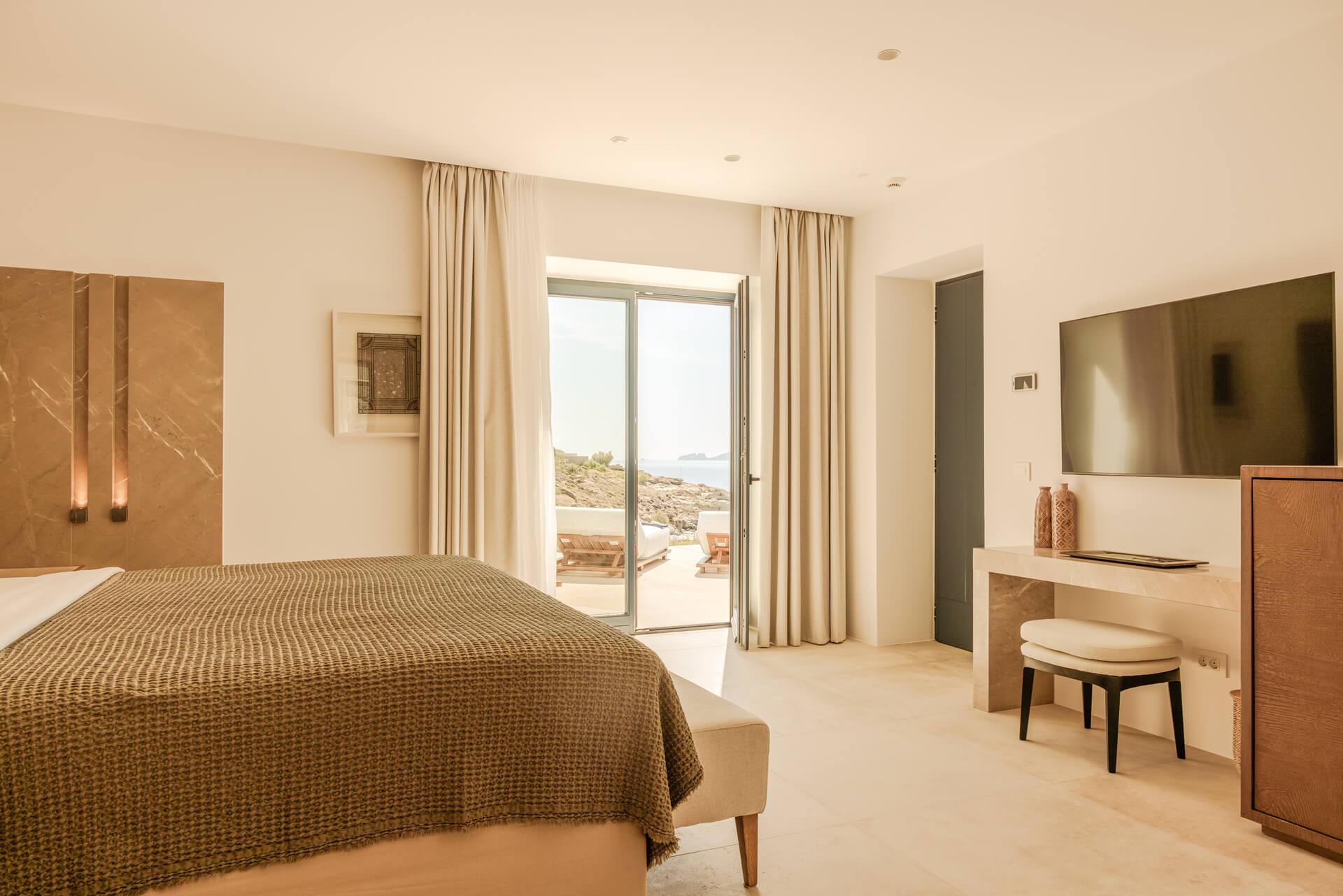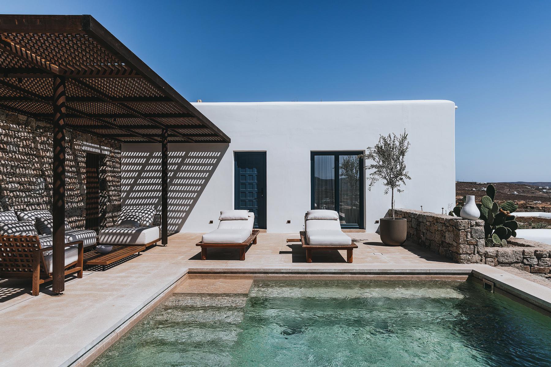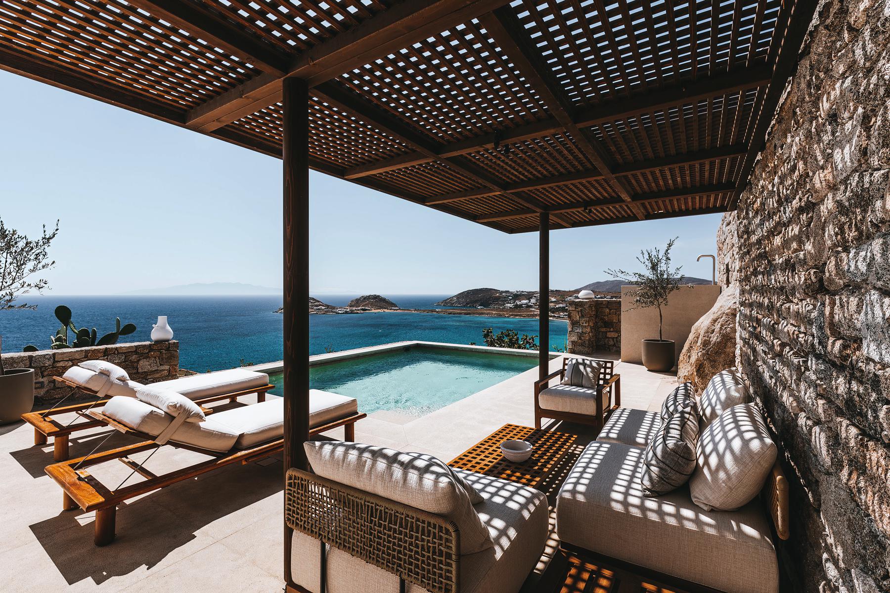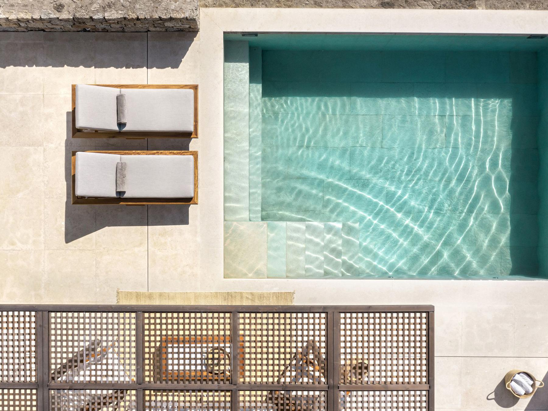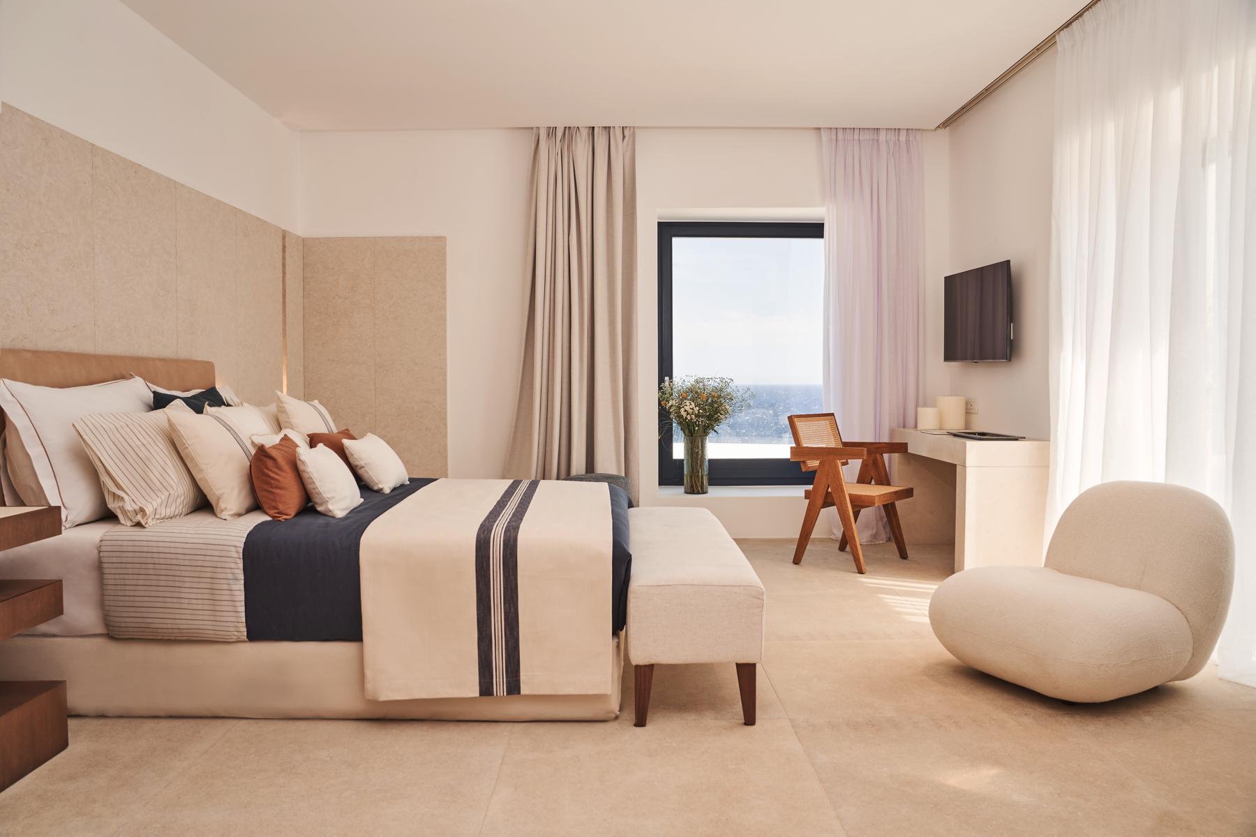 Amidst soft linens, in the water, tranquility is absolute and hushed like a breeze. The Deluxe Pool Suite is made for those craving moments of bliss. The interior spaces include a sumptuous bathroom and a king-size bed, while outdoors, a private terrace with a seawater pool, outdoor shower and grand sea views call for refreshing memories.